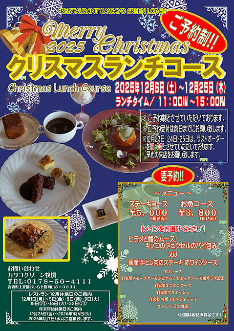 126 일 ~ 25 일 크리스마스 점심 코스 (예약 필요) 12 월 23 일(불)점심 시간에 영업합니다.