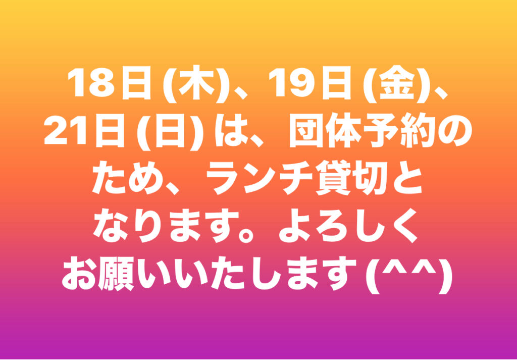 ランチ貸切のお知らせ 18日、19日、21日