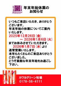 年末年始休業 12月26日(金)~1月6日(火)